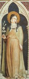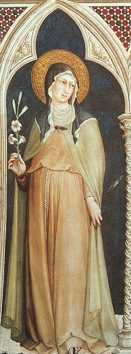 Geboren um das Jahr 1194 als Tochter eines Ritters in Assisi war Clara nicht den für ein Mädchen aus adligem Haus vorgezeichneten Lebensweg gegangen. Tief beeindruckt von der Buß- und Armutsbewegung des in ihrer Vaterstadt wirkenden hl. Franziskus schlug sie die vorgesehene standesgemäße Heirat aus und nahm sie stattdessen im Jahr 1212 aus der Hand des hl. Franziskus das Bußkleid mit Schleier und Gürtel entgegen. Gegen den erbitterten Widerstand ihres Vaters ließ sie sich bei der kleinen Kirche San Damiano vor den Toren von Assisi nieder, wo sie als Vorsteherin einer rasch wachsenden Schar von Gefährtinnen die Ideale der vollkommenen Armut in der Nachfolge Christi und der tätigen Nächstenliebe zu verwirklichen suchte. Bereits zu Lebzeiten hoch verehrt erschütterte ihr Tod im Jahr 1253 die damalige Welt. Papst Innozenz IV. nahm persönlich das Begräbnis vor, bereits zwei Jahre später wurde sie heiliggesprochen. Noch heute ist ihr Grab in der Kirche S. Chiara in Assisi das Ziel zahlreicher Pilger.