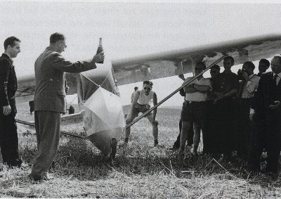 Nach der Fertigstellung beider Segelfluggleiter erfolgte die Taufe am 12.05.1935 in Bornheim durch den Amtsbürgermeister, Paul Henter. Der Segelfluggleiter „Zögling" wurde auf Wunsch des Taufpaten Frh. von Diergardt auf dem Namen „Manfred von Richthofen" und die „Grüne Post" auf den Namen „Günther Grönhoff", einem damals sehr bekannten und 1932 tödlich verunglückten Segelflieger getauft.