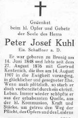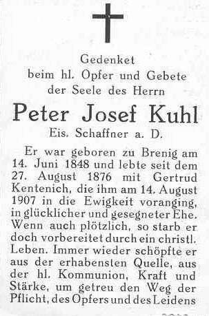 So war es auch mit dem am 14.6.1848 in Brenig geborenen Peter Josef Kuhl, der die aus dem selben Dorf stammende Gertrud Kentenich heiratete, Sohn und Enkelkinder bekam, seinen Lebensunterhalt als Eisenbahnschaffner verdiente, dann nach dem Tod seiner Frau eine Reihe von Jahren in Roisdorf bei Verwandten lebte und schließlich in Köln-Deutz am 24.3.1930 verstarb.
