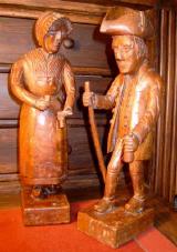 Das Paar könnte die sonntägliche Bauerntracht repräsentieren, die im Vorgebirge bis in die Mitte des 19. Jahrhunderts üblich war, dann aber als antiquiert aufgegeben wurde. Der Schnitzer wird sie aus seiner Jugend oder Kindheit gekannt haben. Dass diese Tracht, über die insgesamt wenig Informationen vorliegen, hier detailliert überliefert ist, verleiht den beiden Figuren einen hohen dokumentarischen Wert. Ob der Schnitzer hier konkretes altes Ehepaar zum Vorbild genommen hat - vielleicht waren seine Großeltern noch auf diese Weise gekleidet -, lässt sich natürlich nicht mehr ergründen, ebenso wenig, was er genau mit der Darstellung bezweckte, aus welchen Anlass heraus sie entstand und natürliche auch wann. Dass das ganze als Karikatur gedacht war, liegt indes nahe und macht den besonderen Reiz der Figuren aus.