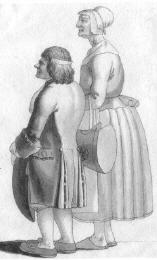 Bemerkenswert ist die in allen Einzelheiten präzise wiedergegebene Kleidung. So trägt der Mann über seinen Kniebundhosen eine zugeknöpfte Weste und drüber einen offenen Rock. Mächtig erscheint der mit einer Spange auf der linken Seite gezierte Zweispitz auf seinem in der typischen Weise von Kuhl gestalteten, durch parallele Kerben strukturierten Haar. Samt dem Hut ist der Mann ebenso groß wie die Frau, die über ihrem langärmeligen Kleid ein doppelgeschlagenes Schultertuch trägt. Vorne an den Enden des Schultertuchs ist mit einer langen Nadel der Latz der Schürze befestigt, die vorne mit einer Schleife verschnürt ist. Den Kopf bedeckt eine flache, unter dem Kinn festgebundene Haube, ebenfalls mit einer Schlaufe geziert und nach vorne hin in Rüschen gefältelt ausgebildet. Sowohl der Mann als auch die Frau tragen Holzschuhe.